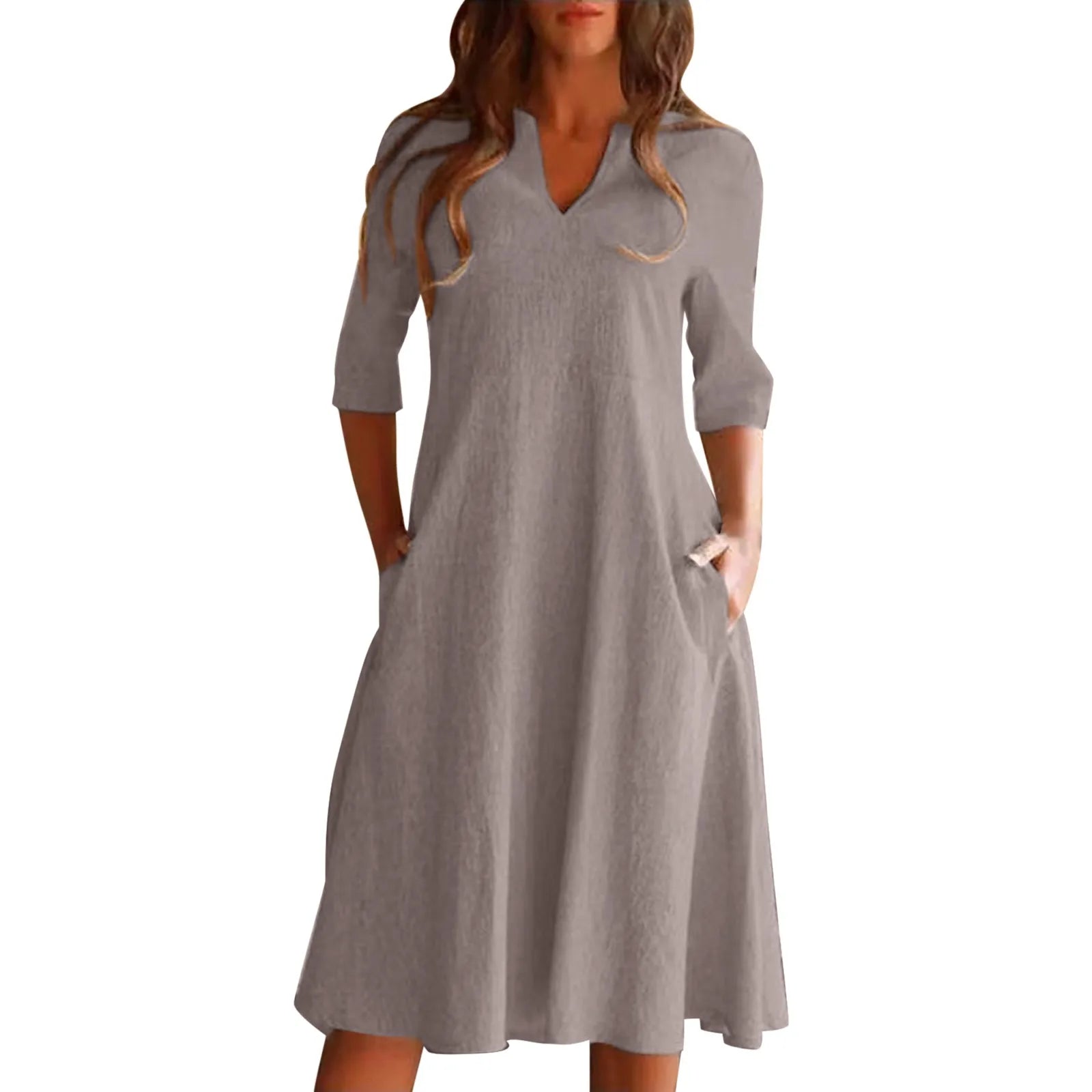 Women's Summer V Neck Casual Solid Color Cotton Linen Swing Dress